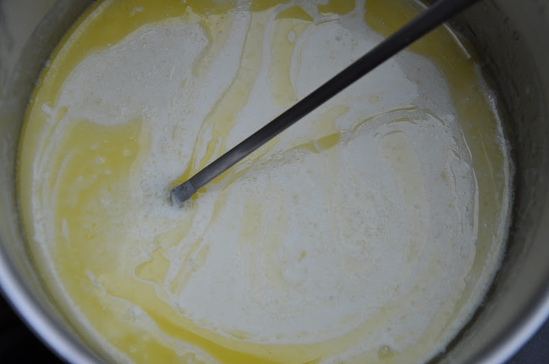 - Start med at smelt smørret i en gryde, når det er smeltet tilsættes mælk og yoghurt. Tag gryden af varmen.