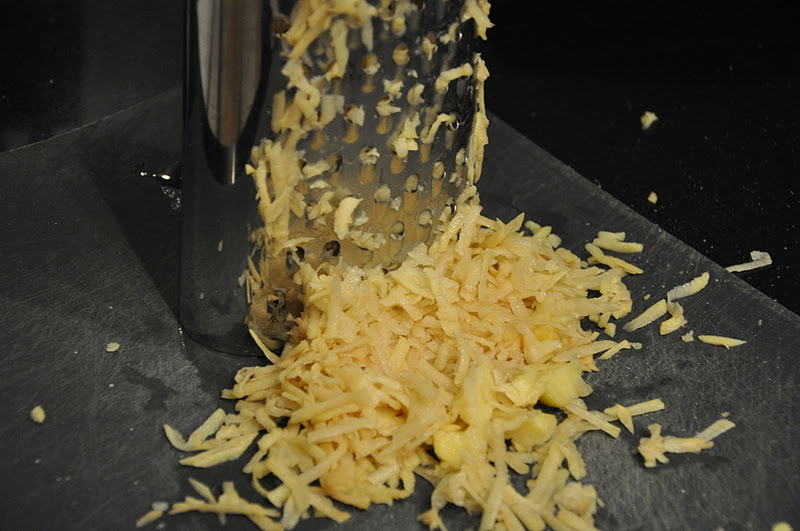 - Skæl kartoflerne på et rivejern og sørg derefter for at saften kommer godt ud af kartoflerne. Hæld de skællede kartofler op i en skål og tilsæt salt, peber paprika og lidt tørret basilikum (her kan også puttes andre krydderier i) Form röstierne på et stykke bagepapir, på en bageplade.
