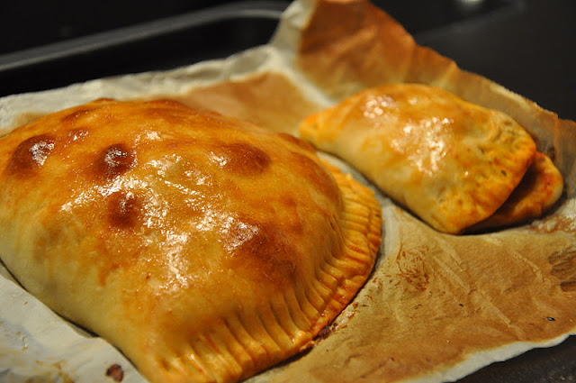 - Calzonerne bages i varmlufts ovn ved 225 grader i ca. 15 min, til de ser gyldne ud på toppen. Hvis man vil, kan man sagtens lave mindre calzoner og fryse dem ned, så man har lidt til madpakken :-)
