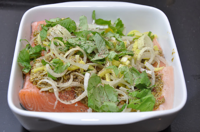 - Læg laksefileterne i et ovnfast fad og smør dem med pesto og chili/hvidløgs pastaen. Drys med porre og krydr’ med salt og peber. Put det i en forvarmet ovn på 200 grader i 15 min (kan variere lidt ift. tykkelse, men vores var perfekte efter 15).