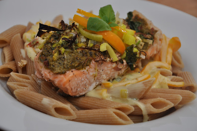 I aftes var det fiske-aften og vi ville lave noget laks. Det blev til laksefileter smurt med pesto og chili/hvidløgs pasta serveret med fuldkornspasta og en sauce på madlavningsfløde, peber og forårsløg. Retten tog ikke mere end 30 min, og mens laksen var i ovnen, blev saucen lavet klar. Meget nem og lækker ret, der sagtens kan bruges som fest måltid – så lækkert smagte det i hvert fald. Vi har før prøvet at lave laks med pesto og hytteost, som også klart kan anbefales. Riv evt. lidt citronskal over – det er også godt til fisk. Vi var heldige at denne laks blev tilberedt perfekt, det er ikke altid nemt ift. tykkelse på fileterne, men de her var super saftige. Så hvis jeres laks har nogenlunde samme størrelse så giv den 15 min. i en forvarmet 200 grader varm ovn.