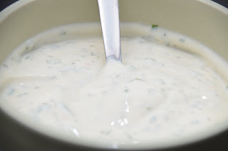 5. Til pandekagerne lavede vi en krydderdressing der bestod af 1 tsk sennep, 1 spsk chilisauce, lidt frisk hakket persille og basilikum samt 2 dl creme fraiche – smagt dressingen til med salt og peber.