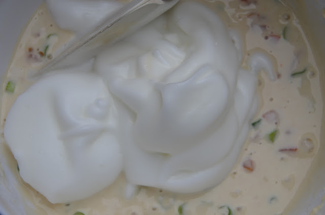 3. Pisk æggehviden i en skål for sig selv til den er helt stiv og vend den forsigtigt i skålen med alle de andre ingredienser.