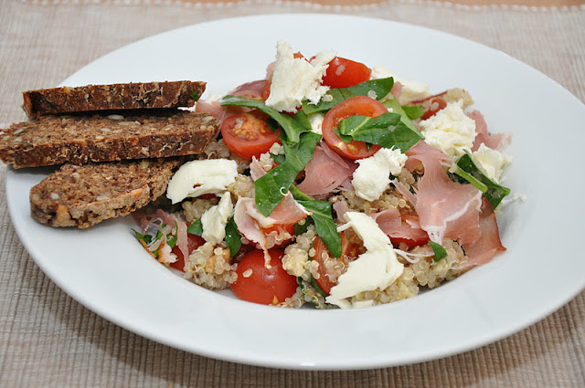 Denne salat stammer fra det elskede Spis Bedre blad. Dog er de friske figner erstattet med tørrede – vi ved ikke hvorfor men de var ikke nemme at anskaffe sig. En nem salat, der kun tager den tid at lave som quinoaen skal koge. Sammen med quinoaen blandede vi de tørrede figner, mozerella, seranoskinke, cherry tomater og hakket frisk spinat. En frisk og mættende ret. Til salaten serverede vi en skåret rugbolle. Selvom quinoa ikke er en kornsort, vil man helt sikkert også kunne bruge enten bulgur eller couscous i denne salat – det gode ved quinoa er, at det har et højt protein indhold. Det er vigtigt at skylle quinoaen godt før brug, da de har et højt indhold af saponiner, som godt kan gøre quinoaen bitter. Udover i salater, kan quinoa også sagtens anvendes i bagværk eller grød.
