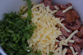 - Bland løg, æg, ost, rucola og pølser i en skål, kom quinoaen i når denne er færdig kogt – bland det hele godt sammen.