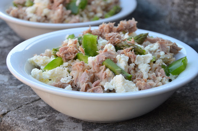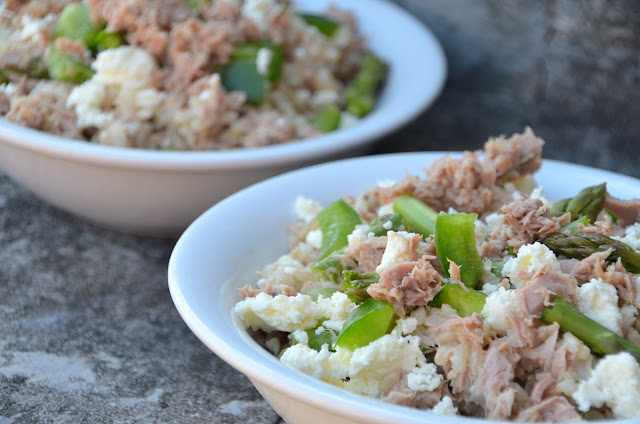 - Når ris er færdig blandes tun, ricotta, peper, asparges sammen