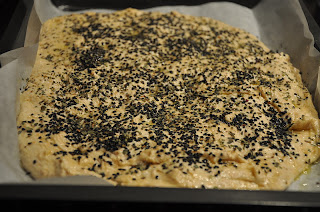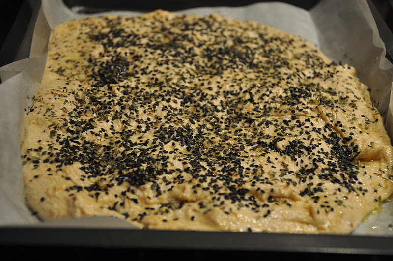 - Kom dejen i en bradepande med bagepapir. Pensl overfladen med olivenolie og top med ønsket fyld – her drysset med sesamfrø, tørret basilikum og revet ost.