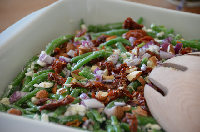 Sidste fredag spiste Christine med nogen fra hendes hold og blev præsenteret for denne her dejlige salat af en sød veninde, Camilla Christine, der iøvrigt har en rigtig dejlig blog. Vi prøvede selv at lave salaten her i ugen og den var bestemt ikke blevet dårligere. En dejlig frisk sommerlig salat og meget hurtig at lave. Den består af grønne bønner, hytteost, rødløg, soltørrede tomater og mandler. De frosne grønne bønner blev overhældt med kogende vand, og efter de var kølet lidt af, blev de vendt med de andre ingredienser. Salaten serverede vi til madklub sammen med kylling og en rodfrugte salat. Salaten fungerer rigtig godt som tilbehør til alverdens retter. Derudover ville man også kunne lave det til en hovedret ved fx at tilsætte stegt kylling – en aftensmad vi ville synes var rigtig lækker :-)