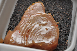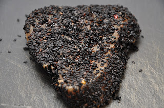 Hæld soya, chilisauce, citronsaft og salt i en pose og kom tun bøfferne ned i den. Massér marinaden godt ind i tunen og læg posen i køleskabet i min. 1 time. Bland sesamfrø og salt sammen i en skål, hvor tunen kan komme i. Alt de to ting rigtig godt ind i tunen, så det sidder fast og til bøfferne er helt dækket med sesamfrø.