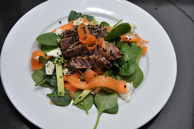 Nu har vi haft disse tunbøffer liggende i fryseren, og vi blev enige om, at det var på tide at spise dem. Vi elsker tun, lynstegt tun, der har fået 1 min på hver side – desværre er det ikke helt billigt. Vi fandt dog de her tunbøffer på tilbud. Denne sesam marineret tun, som vi har stegt få minutter på panden, er helt uimodståelig og meget hurtig at lave. Vi har valgt at lave en salat med avocado, spinatblade, agurk og revet gulerod til tunen. Derudover lavede vi også en dressing, der bestod af lidt grov sennep, olie og balsamico.