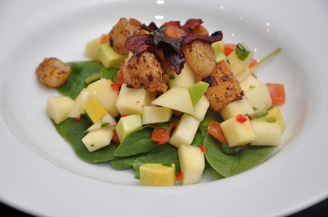 - Steg kammuslingerne på en meget varm pande i smør – et par minutter på hver side og anret dem sammen med mango / avocado salsaen på friske spinatblade.