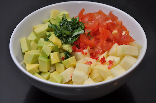 I salsaen blev der udover mango og avocado blandet lidt chili, frisk hakket basilikum, cherry tomater og lidt olie. Jeg kan godt lide den lidt grov og hakkede derfor ikke ingredienserne alt for fint. Det er en nem salsa, der sagtens kan bruges til en masse andet også. Sørg dog for at både mango og avocado er godt modne. Kammuslinger blev fundet på frost, og er bestemt ikke som de store flotte der findes ved fiskehandleren. Så ja køb dem hos fiskehandleren ;-) På toppen blev der drysset med lidt rødbede chips!